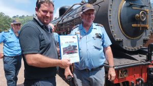 Crowds gathered to witness the historic moment as Colin Healey, one of the founding members of Umgeni Steam Railway re-christened Maureen with the traditional bottle of champagne across her ‘bow’ before Ashley Peters officially handed over Maureen’s log book to the driver and Chief Mechanical Engineer Simon Anderson.